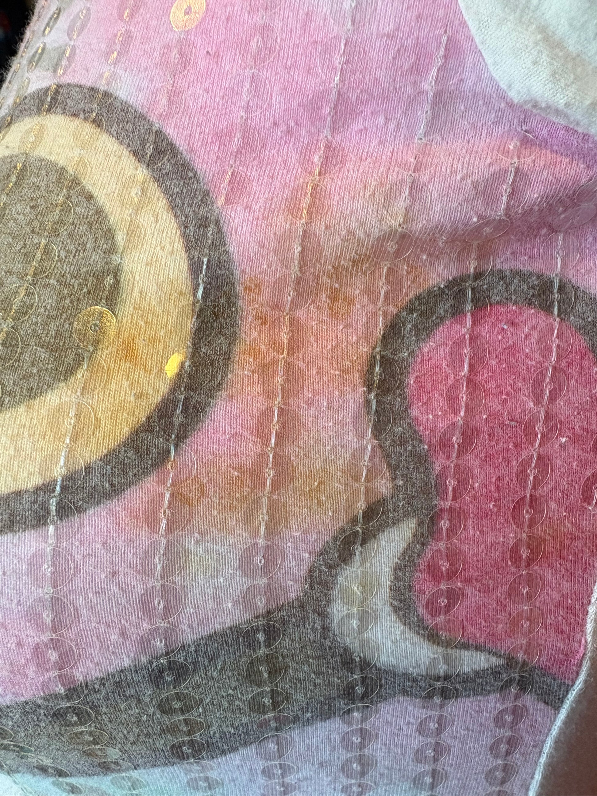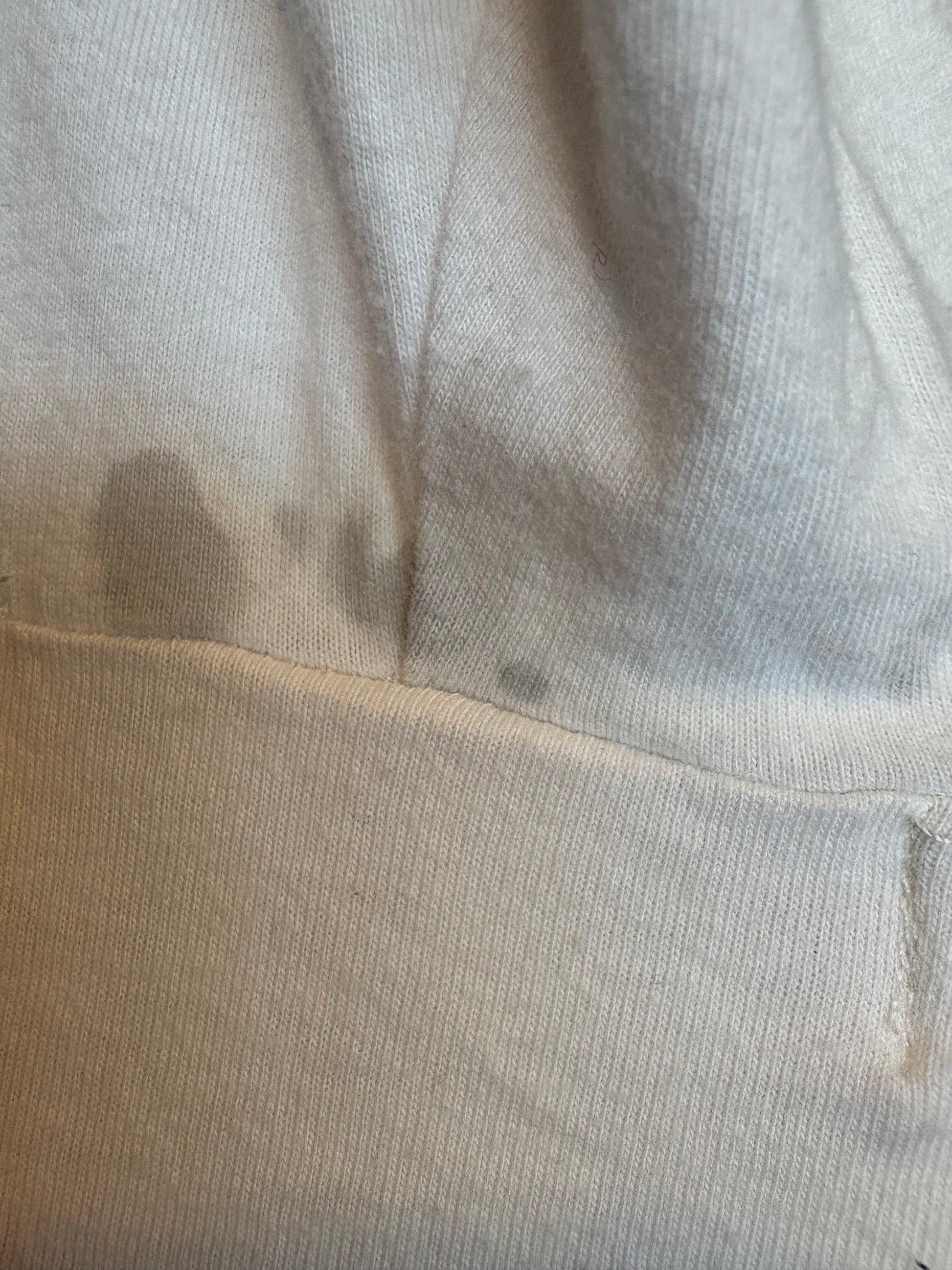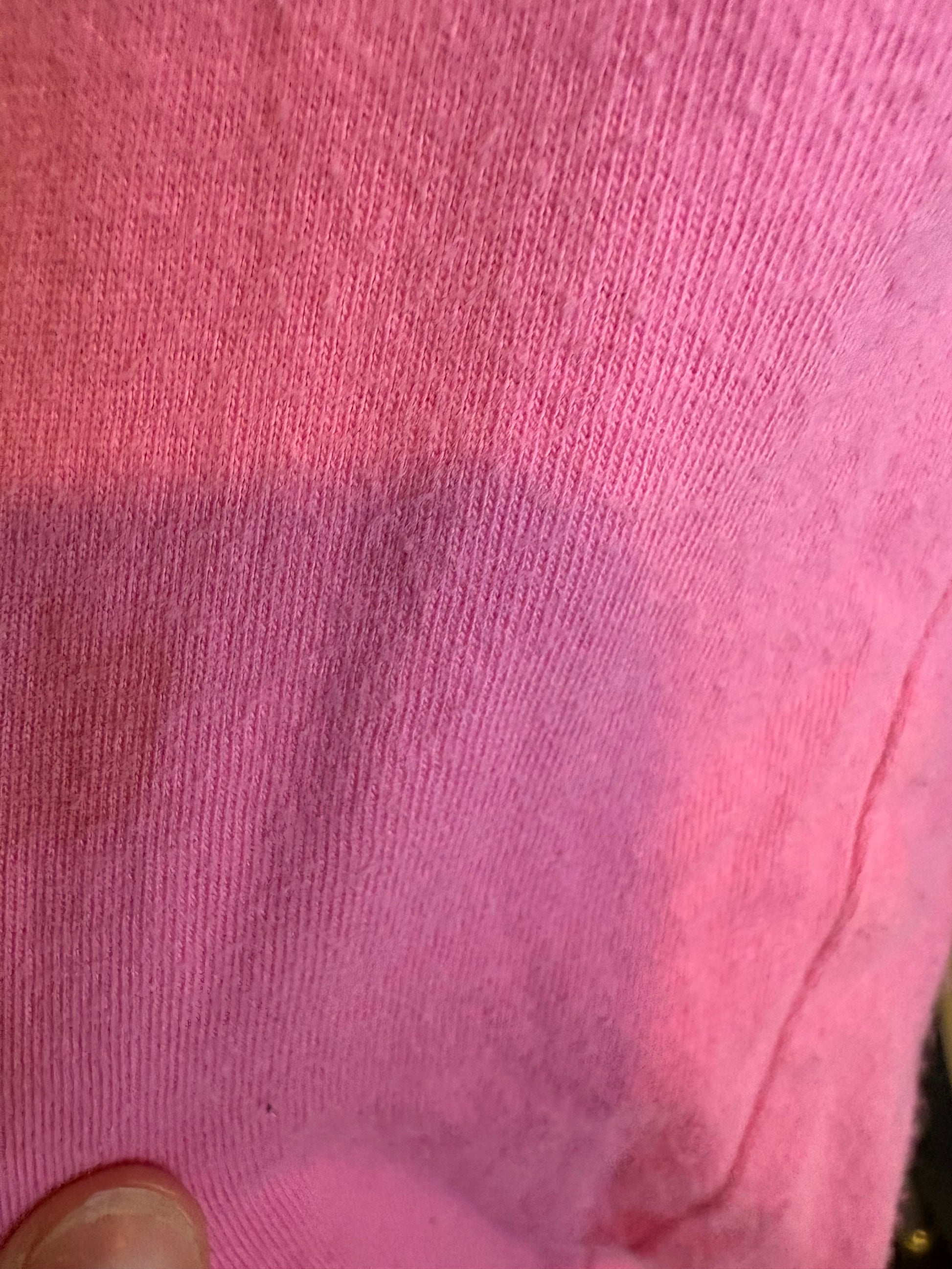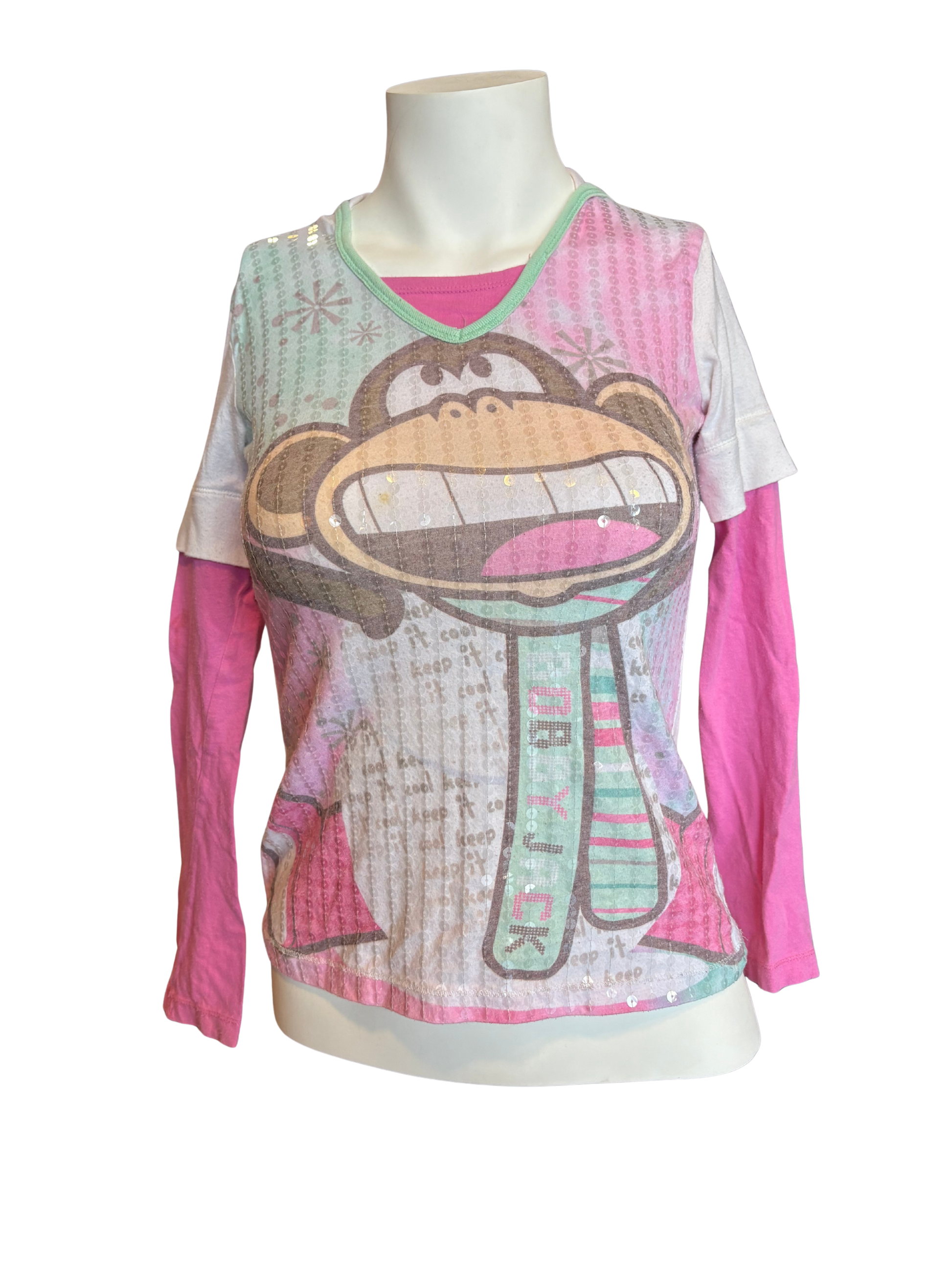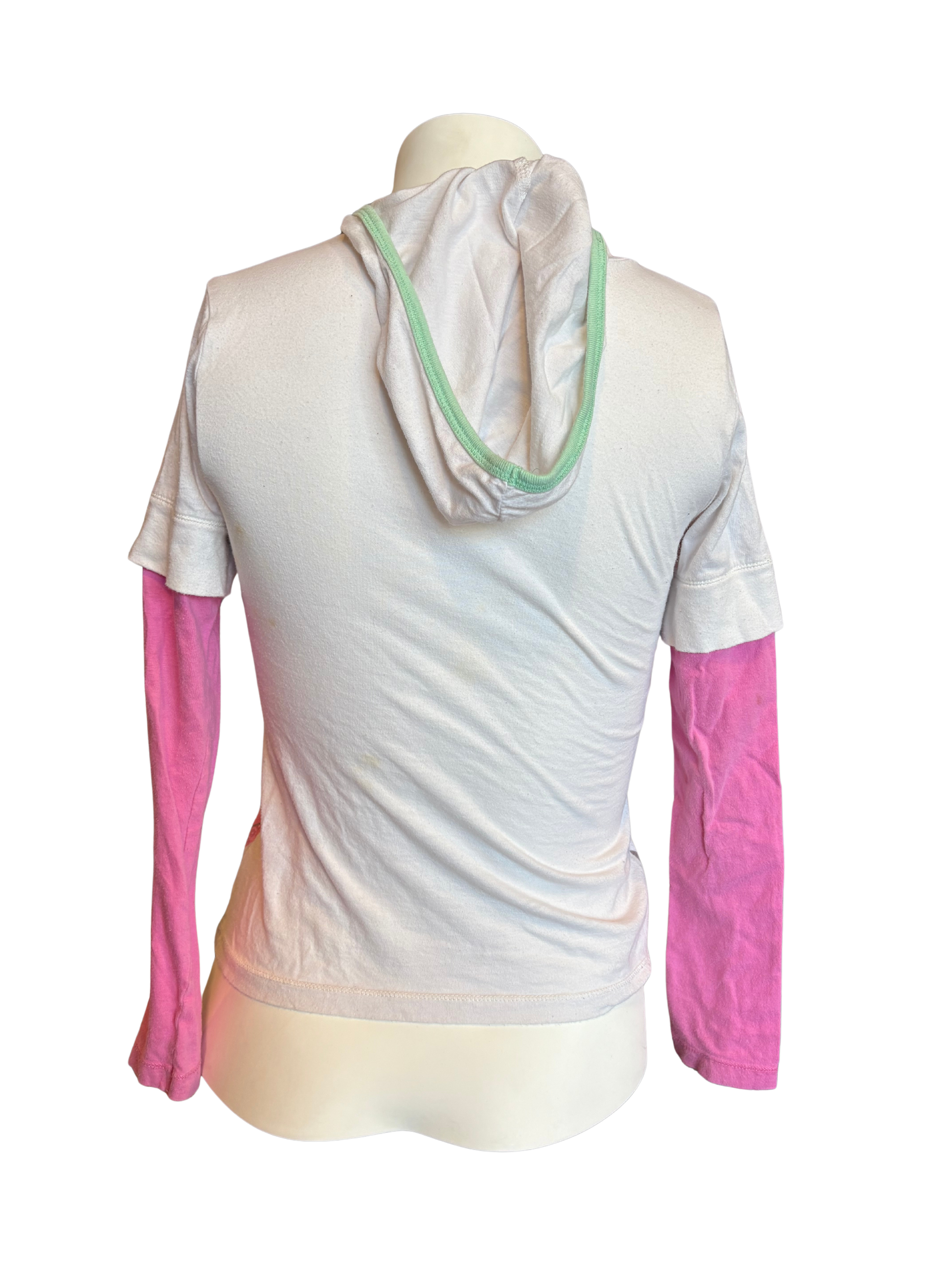An Early 2000s Bobby Jack Pink & White Long Sleeve Hooded Top. There are a few stain spots displayed in the photos.