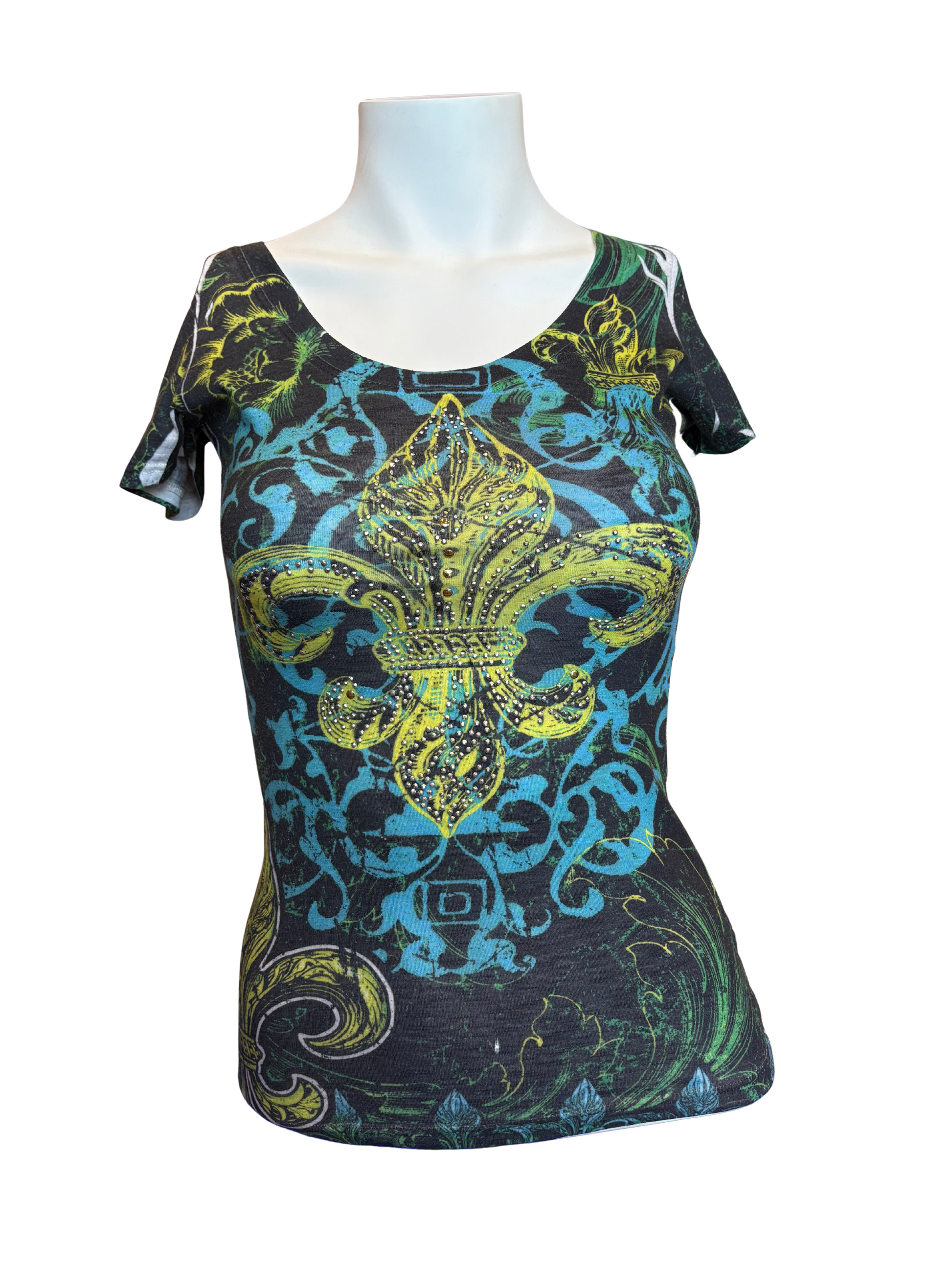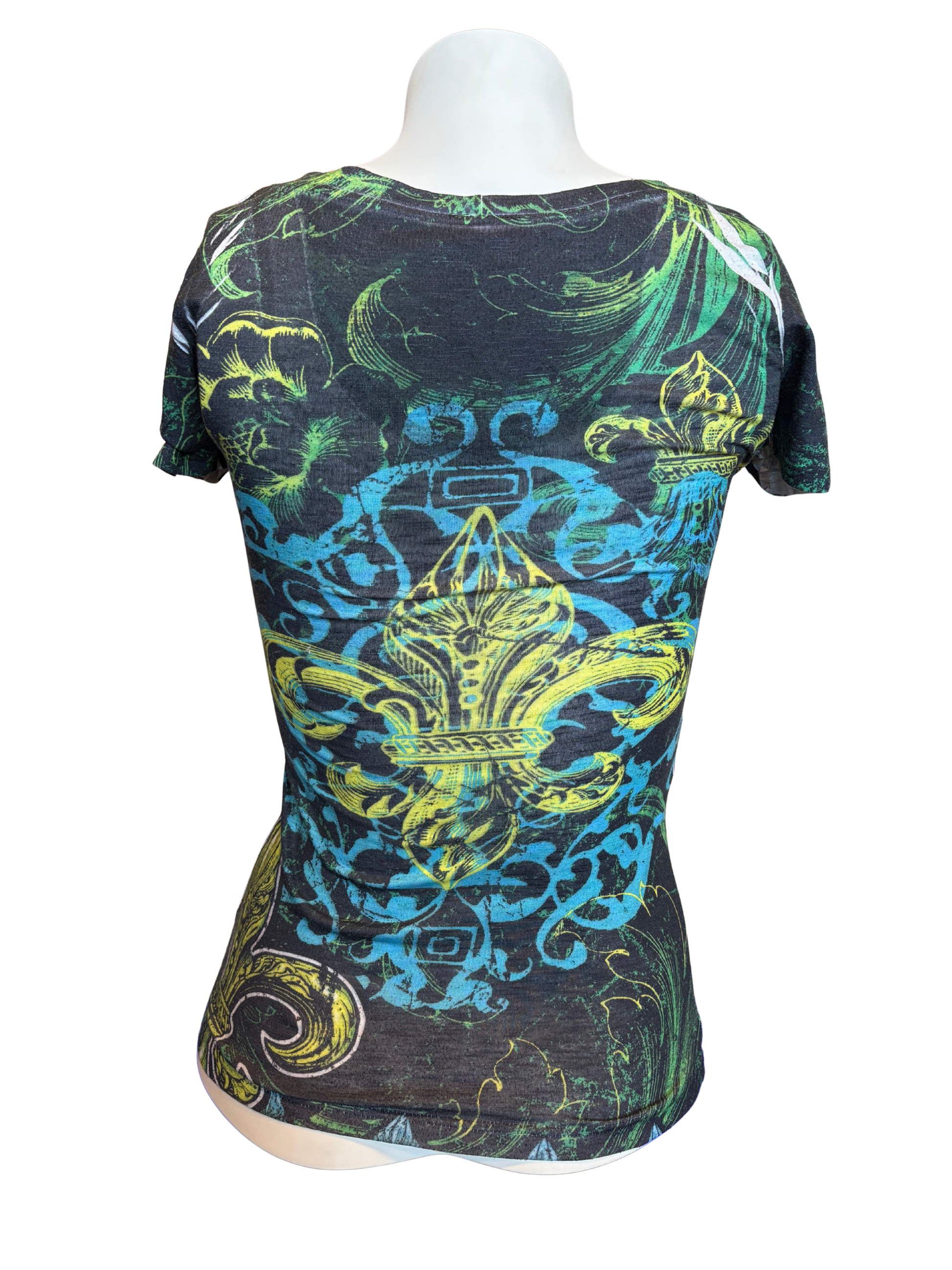 An Early 2000s Branded, Day Trip, Top With Rhinestones Multi-colored. Similar Affliction Style Top.