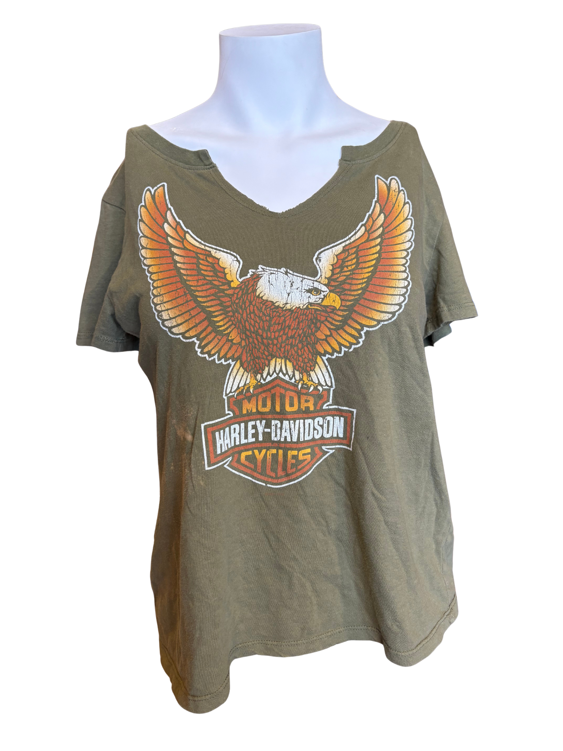 A late 2000s Harley Davidson Green V-Neck Cut Off T-Shirt.